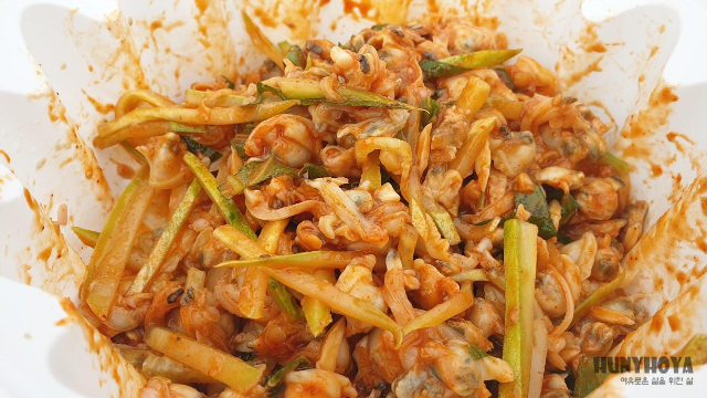 다음은 바지락 살 + 초고추장 + 오이 + 깻잎
