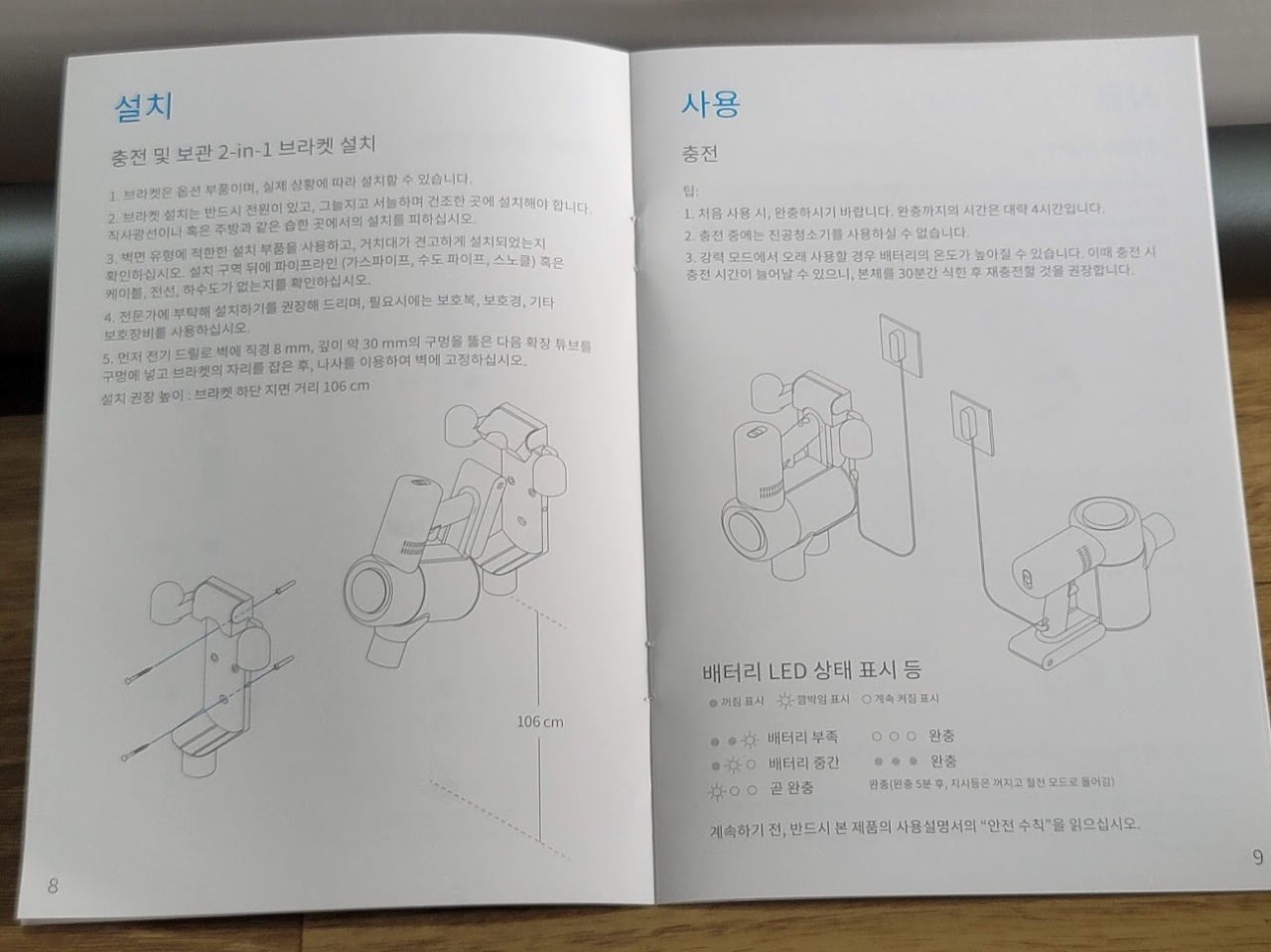 거치대에 전원을 연결하고, 청소기 본체를 끼우니 충전 시작~~!!