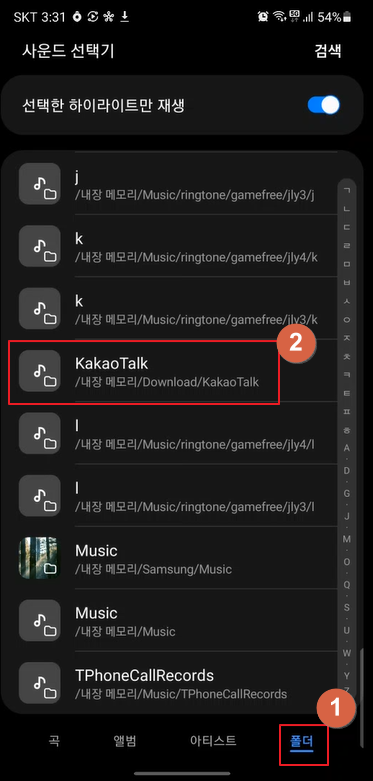 -> 사운드 선택기 하단의 '폴더' -> [KakaoTalk] 폴더