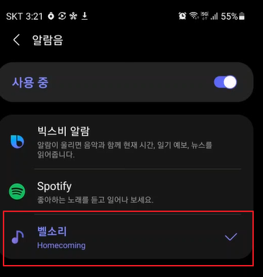 -> 알림음 -> 벨소리에 나만의 벨소리로 변경된 것을 확인
