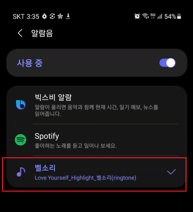 이렇게 쉽게 갤럭시 노트 20의 알림음, 저는 기상 벨소리를 저스틴비버의 Love Yourself 하이라이트 일부분으로 변경을 해놨습니다.