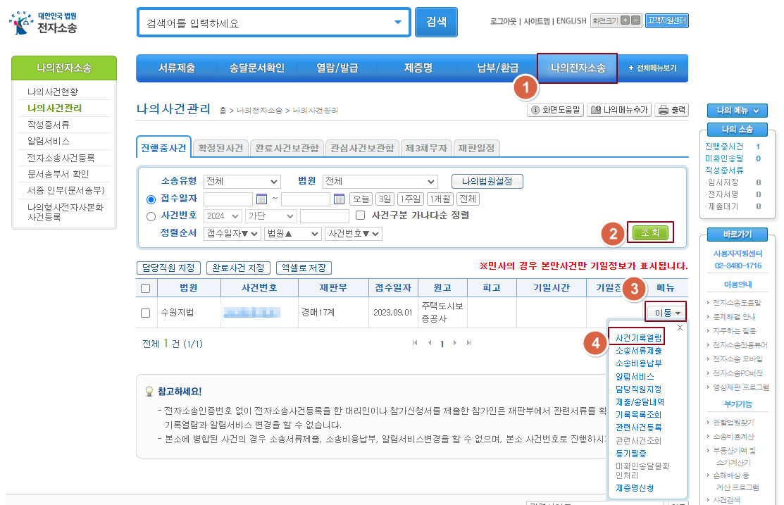 - 조회된 사건 확인 -> 메뉴 이동 -> 사건기록열람