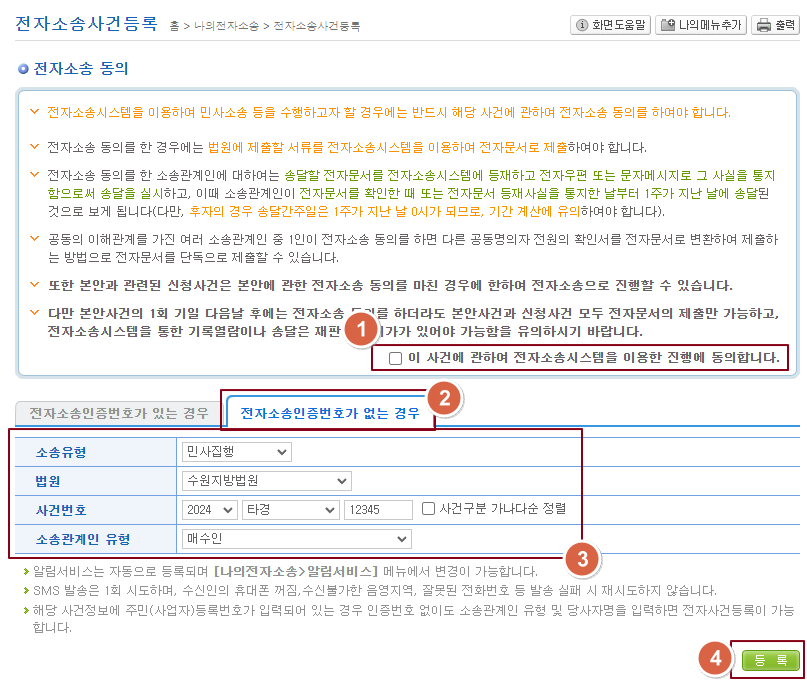 - 해당 사건정보에 주민(사업자)등록번호가 입력되어 있는 경우 인증번호 없이도 소송관계인 유형 및 당사자명을 입력하면 전자사건등록이 가능합니다.라는 안내 메시지를 확인할 수 있습니다.