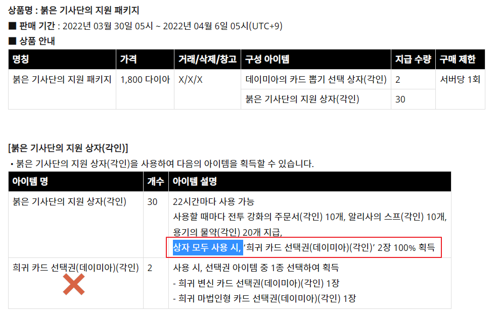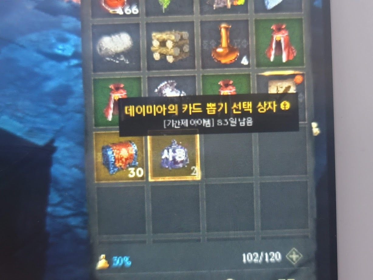 아래 써 있는 '희귀 카드 선택권(데이미아)(각인)'이 아니고 '데이미아의 카드 뽑기 선택 상자' 라고 되어 있어야 하는건데 잘 못 써놔서 헥갈리게...