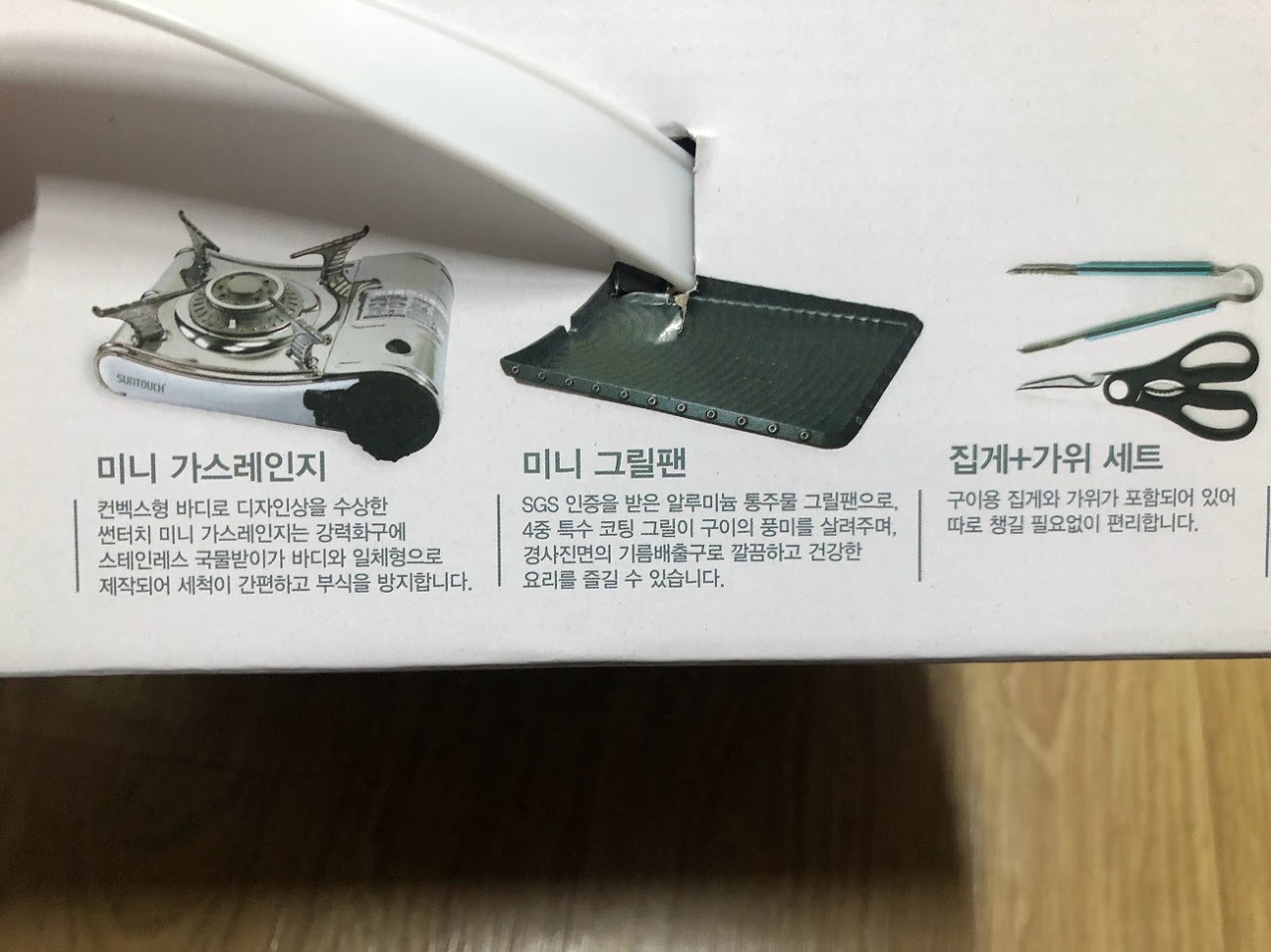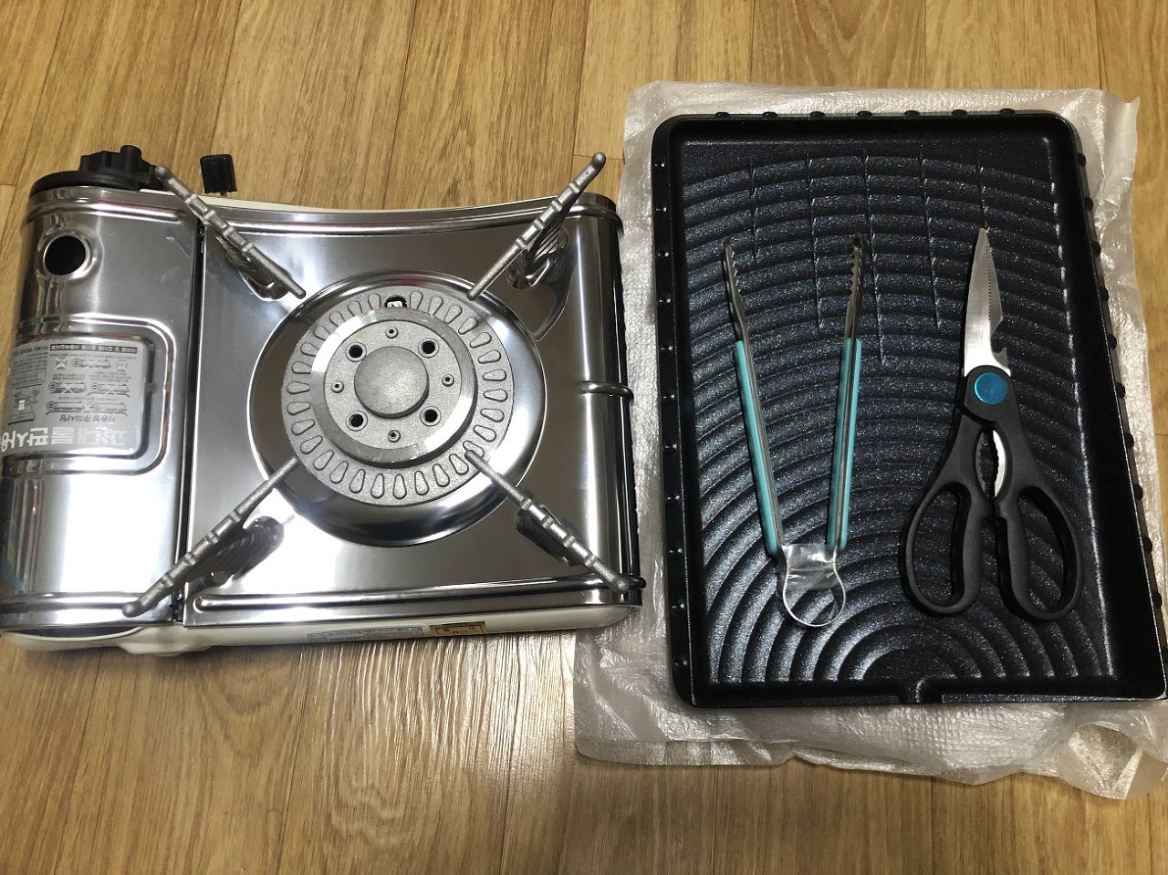 구성품은 미니 버너, 불판, 집게, 가위