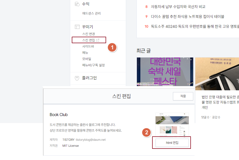 1. 티스토리 관리자 페이지 접속 -> 스킨 편집 -> HTML 편집