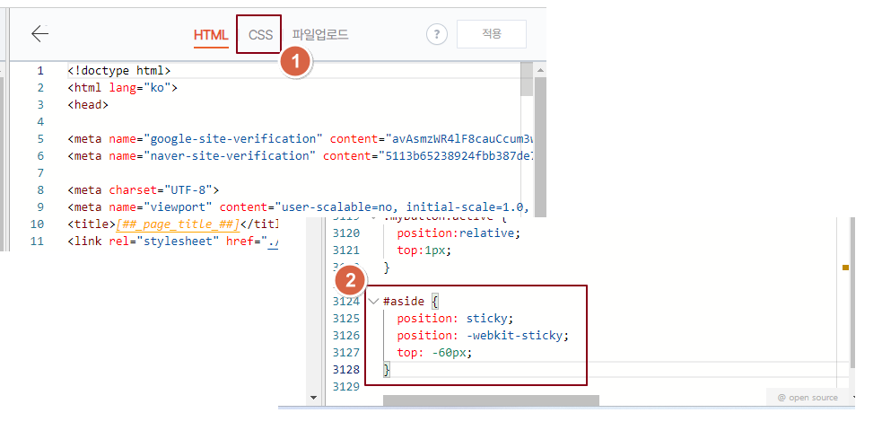 2. CSS 클릭 -> 편집 부분 맨 아래쪽에 코딩 입력