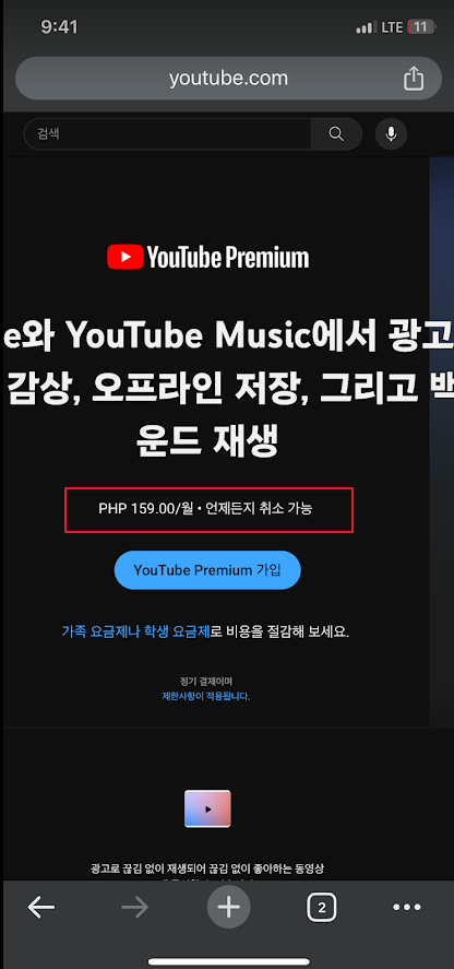 필리핀 유심을 사용 중인 상태에서 유튜브 앱으로 프리미엄에 가입하려니 금액이 한국 금액 14,900원으로 보이더군요...