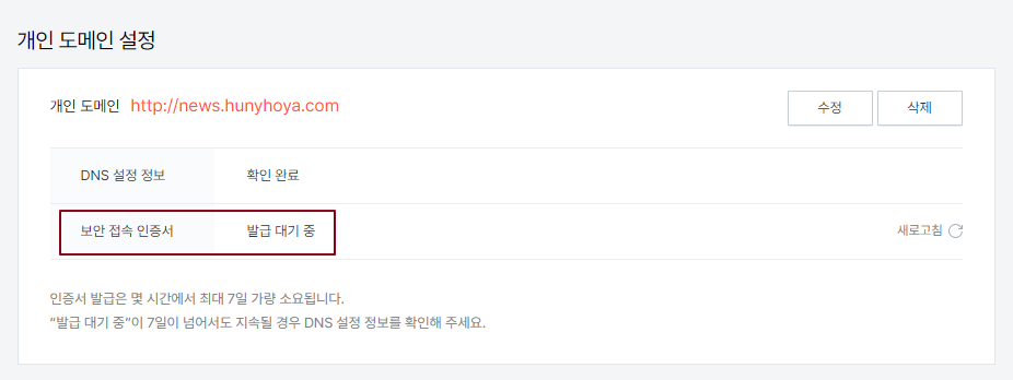 - 이는 보안 접속 인증서 발급이 바로 되지 않고 몇 시간에서 최대 7일가량 소요 된다고 안내하고 있습니다.