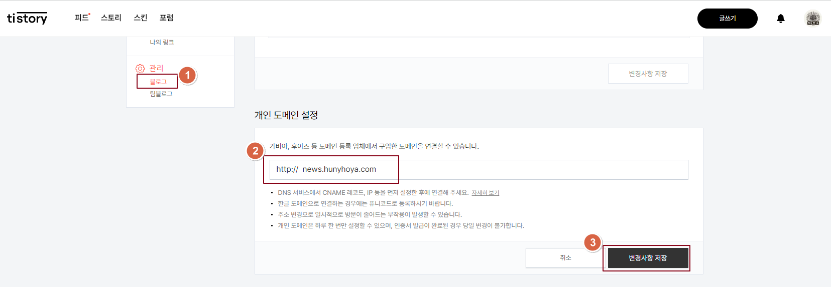 3. 티스토리 개인 도메인 설정