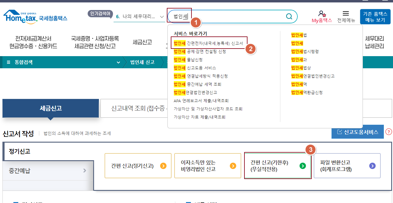 2. 홈택스 검색창에 '법인세' 검색 -> 법인세 간편전자(내국세,농특세) 신고서 클릭