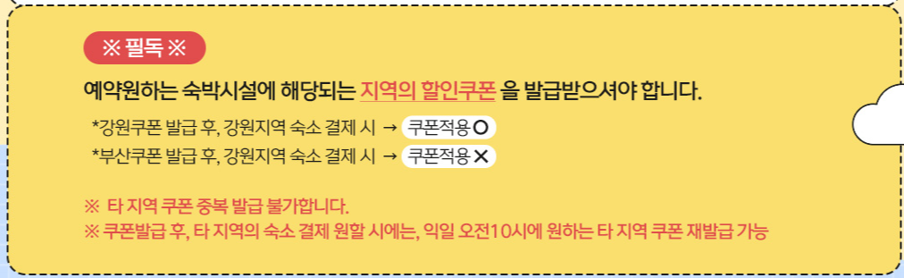 - 일별 유효기간 내 1개 OTA, 1개 지역 쿠폰 선택 가능(유효기간 내 취소시 해당 OTA 내 재발급 가능하나 지역 변경은 불가)