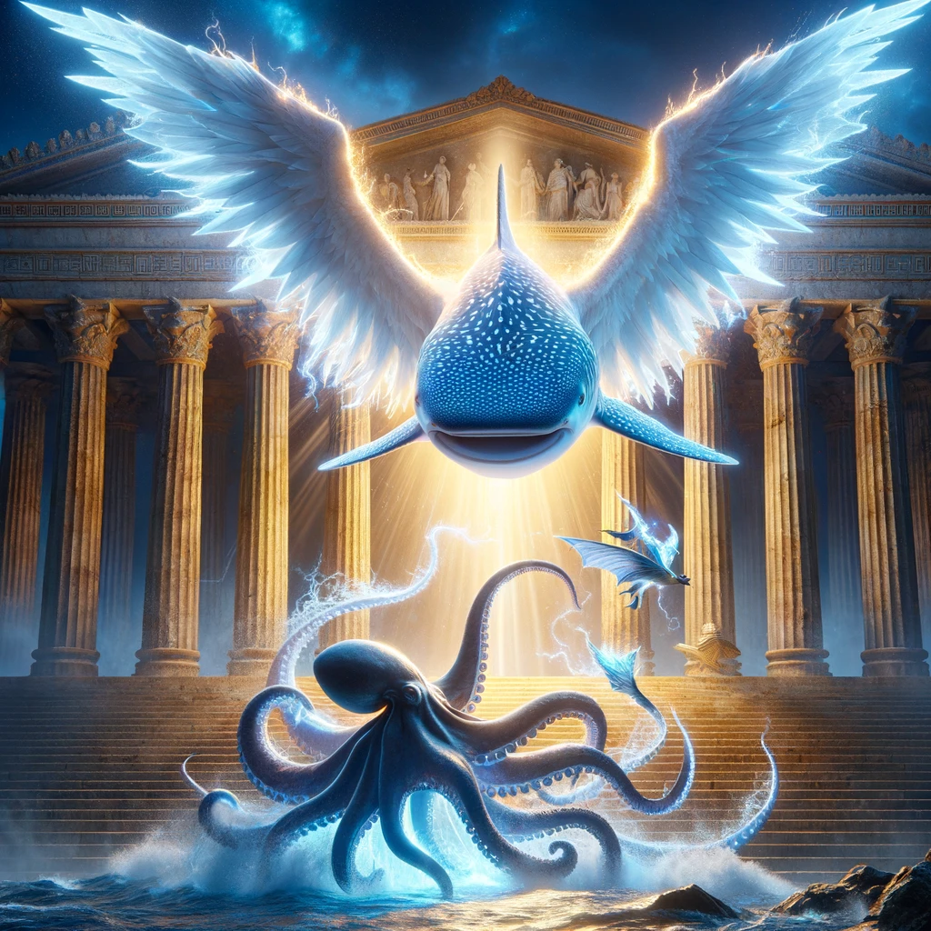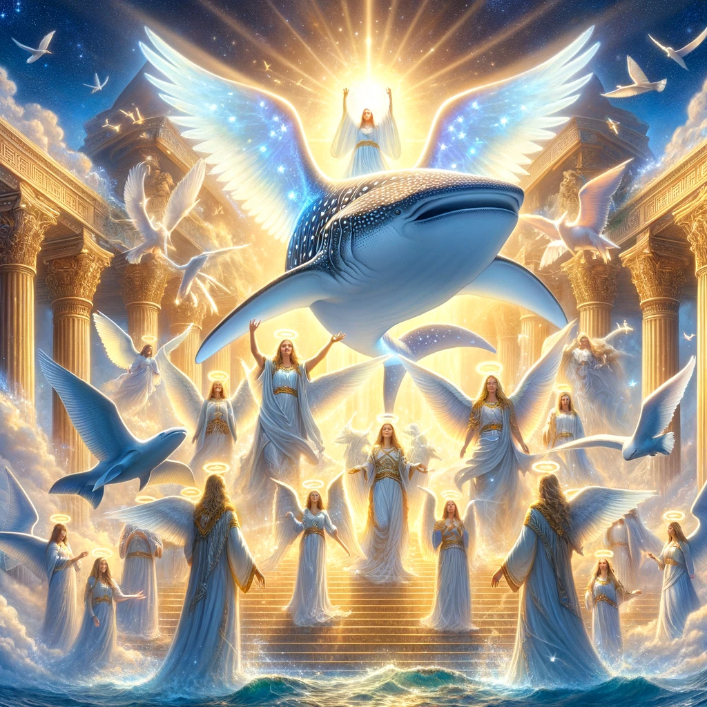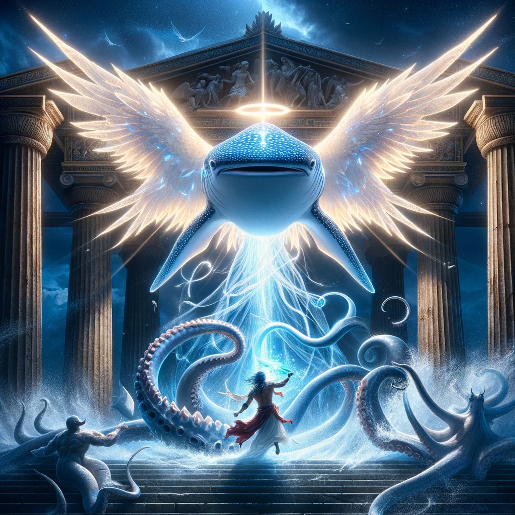 [ you : 올림푸스 신전을 지키는 천사의 모습을 한 고래상어를 그려줘 ]