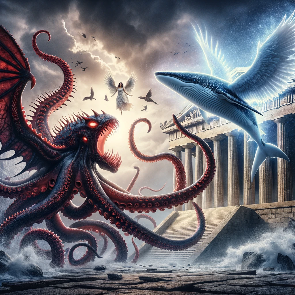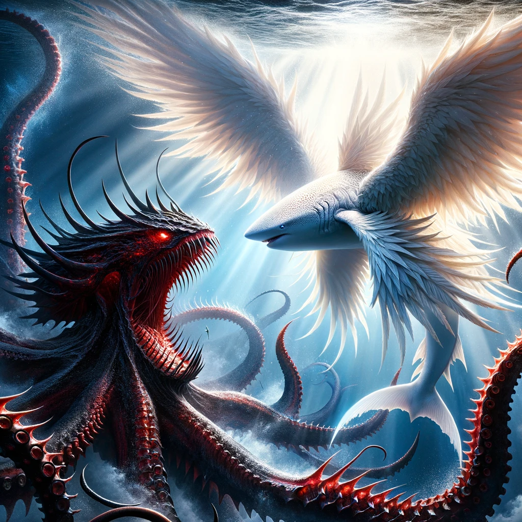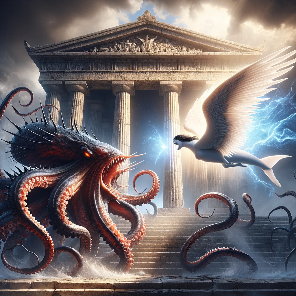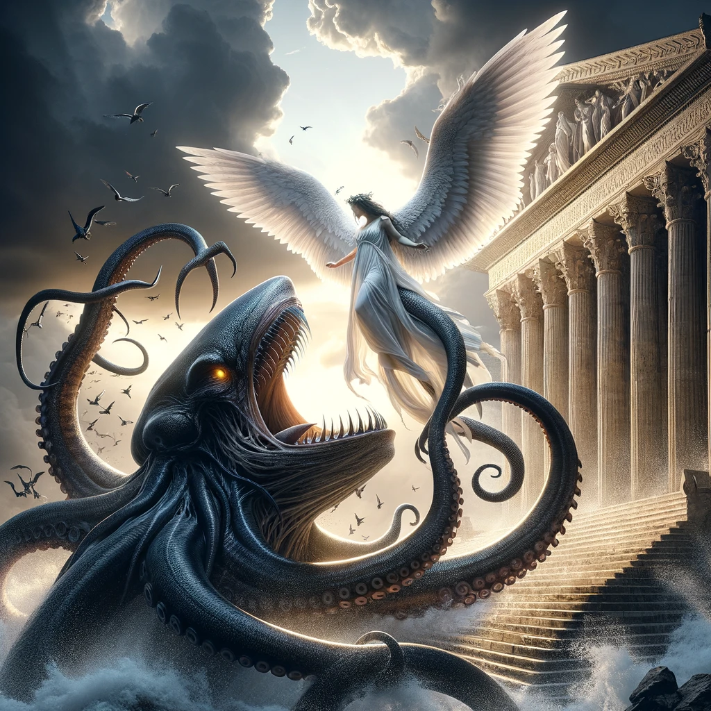 [ you : 올림푸스 신전을 지키는 천사의 모습을 한 고래상어를 그려줘 ]