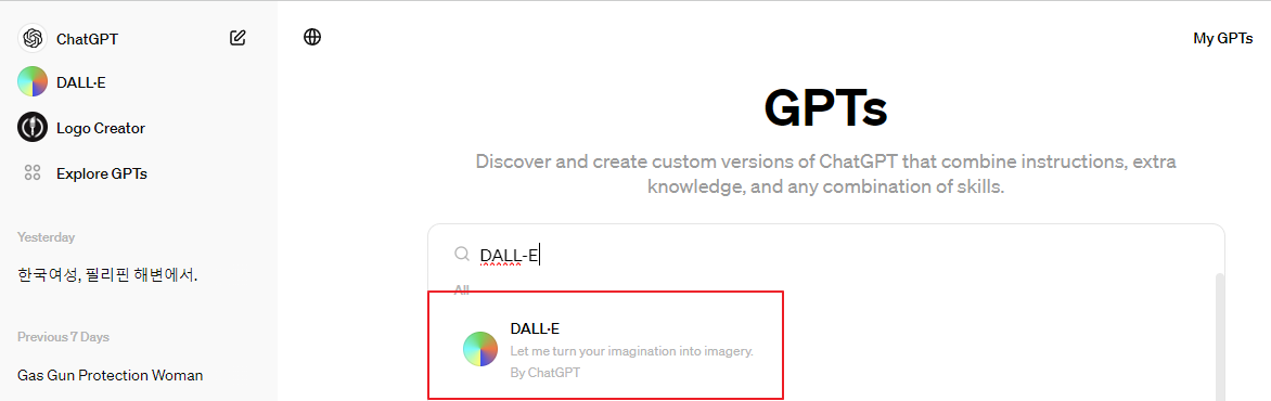 3. 검색창에 [ DALL-E ] 검색  -> 바로가기 링크