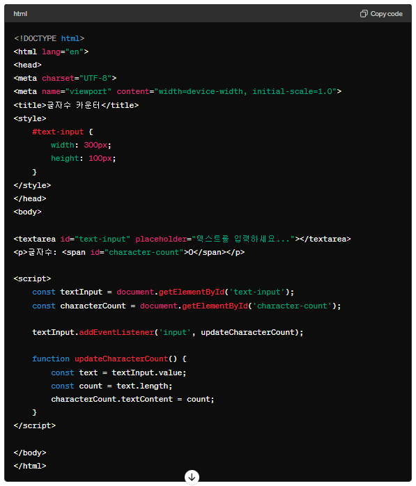 이 코드는 웹 브라우저에서 실행되는 간단한 HTML 페이지입니다. 페이지에는 하나의 텍스트 영역이 있고, 사용자가 텍스트를 입력하면 해당 텍스트의 글자 수가 실시간으로 업데이트됩니다.