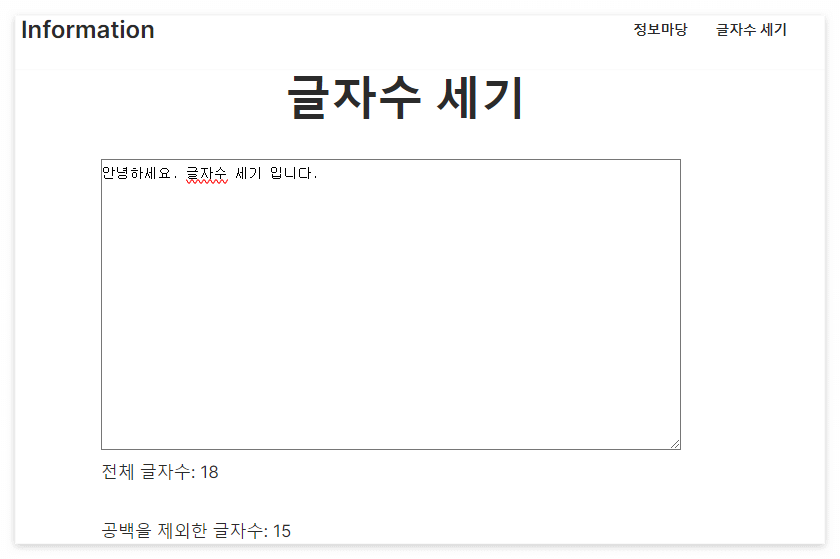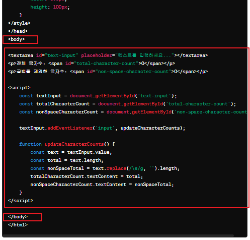 이 코드에서는 updateCharacterCounts() 함수를 통해 입력된 텍스트의 전체 글자 수와 공백을 제외한 글자 수를 계산하고 각각을 각각의 <span> 요소에 업데이트합니다.